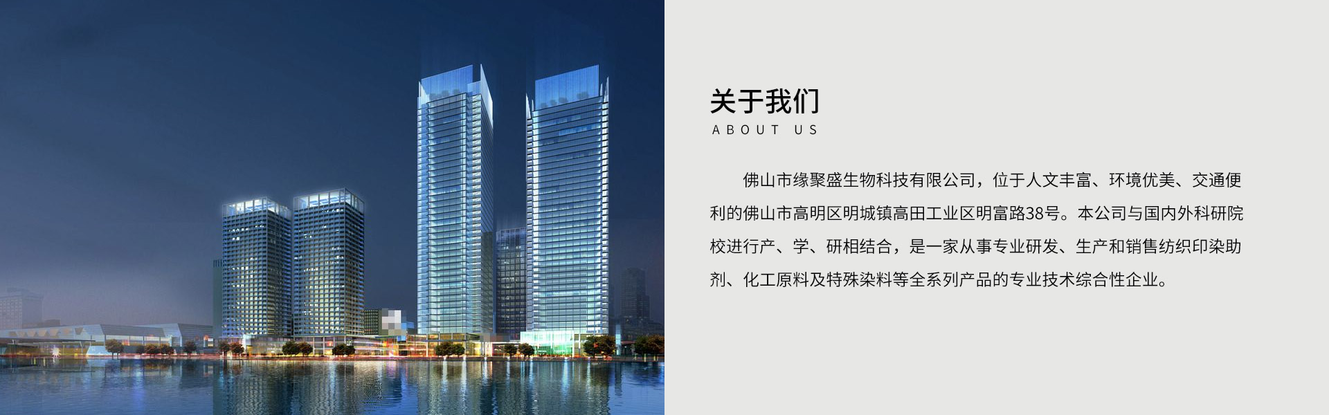 佛山市緣聚盛生物科技有限公司 網站正式上線! 本公司與國內外科研院校進行產、學、研相結合,是一家從事專業研發、生產和銷售紡織印染助劑、化工原料及特殊染料等全系列產品的專業技術綜合性企業。 熱誠歡迎各界朋友前來參觀、考察、洽談業務,歡迎新老客戶來電咨詢,佛山市緣聚盛生物科技有限公司全體成員歡迎您!